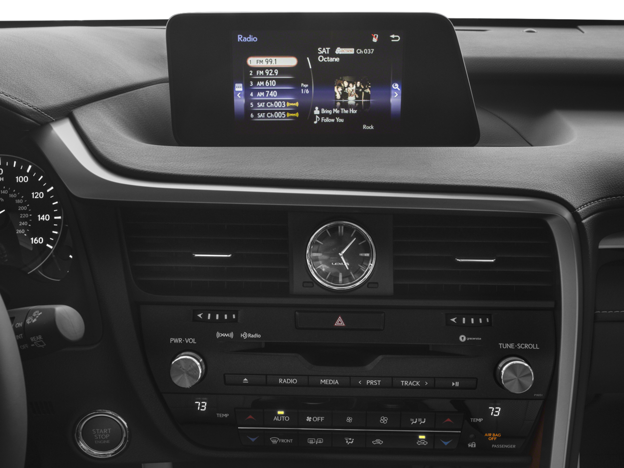 - Radio: AM/FM/CD Lexus Display Audio -inc: 8-inch screen, 9-speaker premium audio system, Bluetooth hands free phone and automatic phonebook download capabilities, Scout GPS link app-based turn-by-turn directions, voice recognition, Cache Radio, ability to pause live AM/FM radio and HD Radio, traffic and weather data provided via HD Radio (free to all users while in HD Radio range), basic traffic map, weather forecast, Siri Eyes Free and Electro Multi Vision (EMV) display