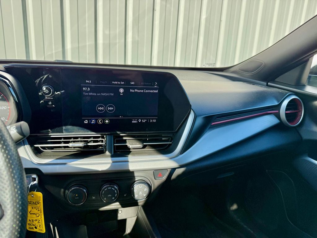The sporty 1RS trim outfits the Trax with distinctive 18-inch aluminum wheels with a high-gloss Black finish, all-season tires, and a bold black grille with RS badging. Inside, you'll find premium cloth seating surfaces with RS embroidery and heated front seats, a heated flat-bottom steering wheel with mounted controls, and ebony interior accents with red stitching. The driver-focused cockpit offers a modern, tech-forward environment, along with automatic climate control and an 8-inch touchscreen audio system with wireless connectivity.
