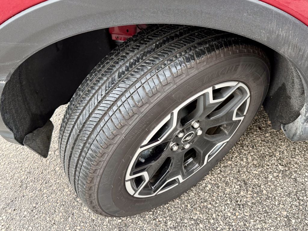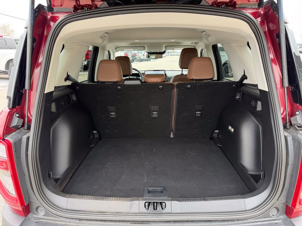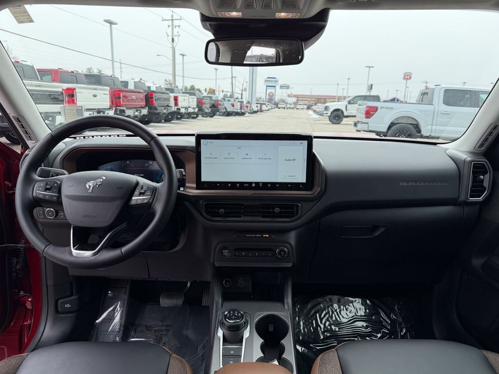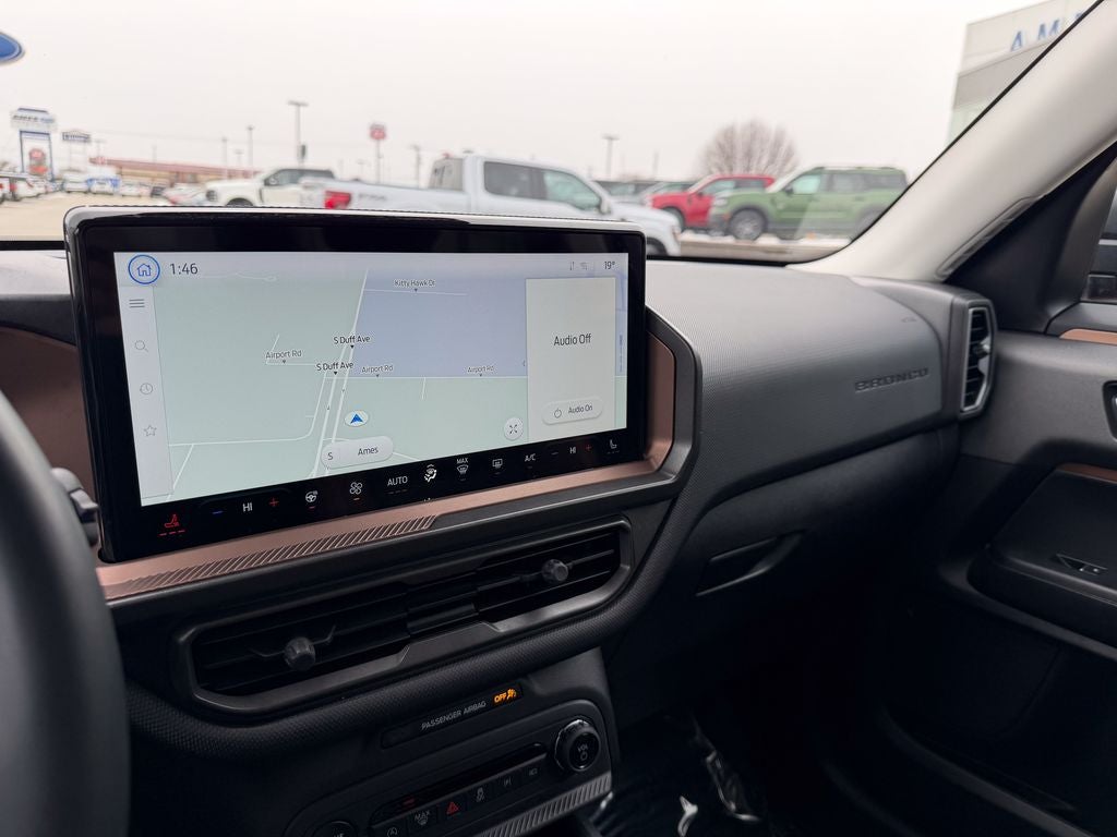 The upscale Outer Banks trim outfits the Bronco Sport with distinctive 18-inch painted aluminum wheels, all-terrain tires, and signature LED lighting with unique Outer Banks badging. Inside, you'll find premium leather seating surfaces with marine-grade vinyl trim, a leather-wrapped steering wheel, and elegant interior accents. The versatile and spacious cabin offers ample cargo space, along with dual-zone automatic climate control and a 6-speaker audio system with SYNC 4 connectivity for every adventure.
